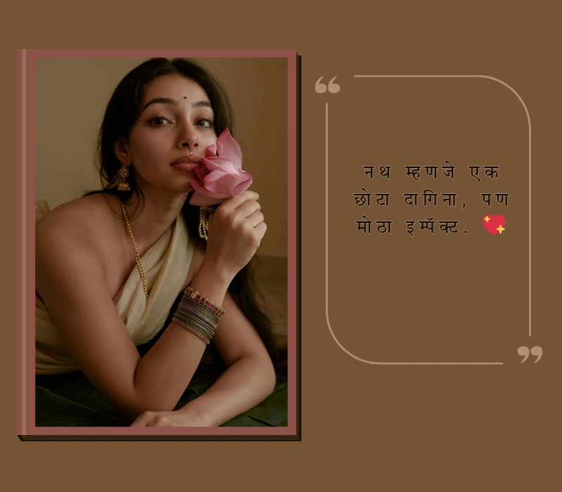 नथ Caption In Marathi For Instagram साधे, आकर्षक, भावनिक आणि स्टायलिश असावेत, जे तुमच्या फोटोचा लूक अधिक सुंदर बनवतात.